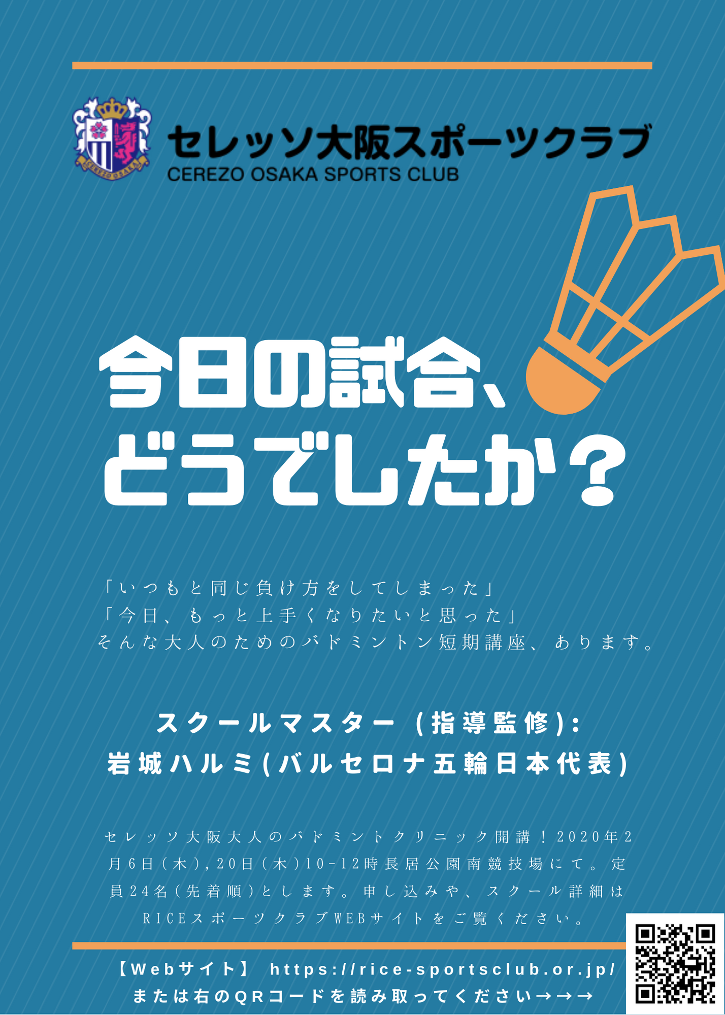 セレッソ大阪大人のバドミントンクリニックを、長居競技場 南体育室にて実施しますのでお知らせします。